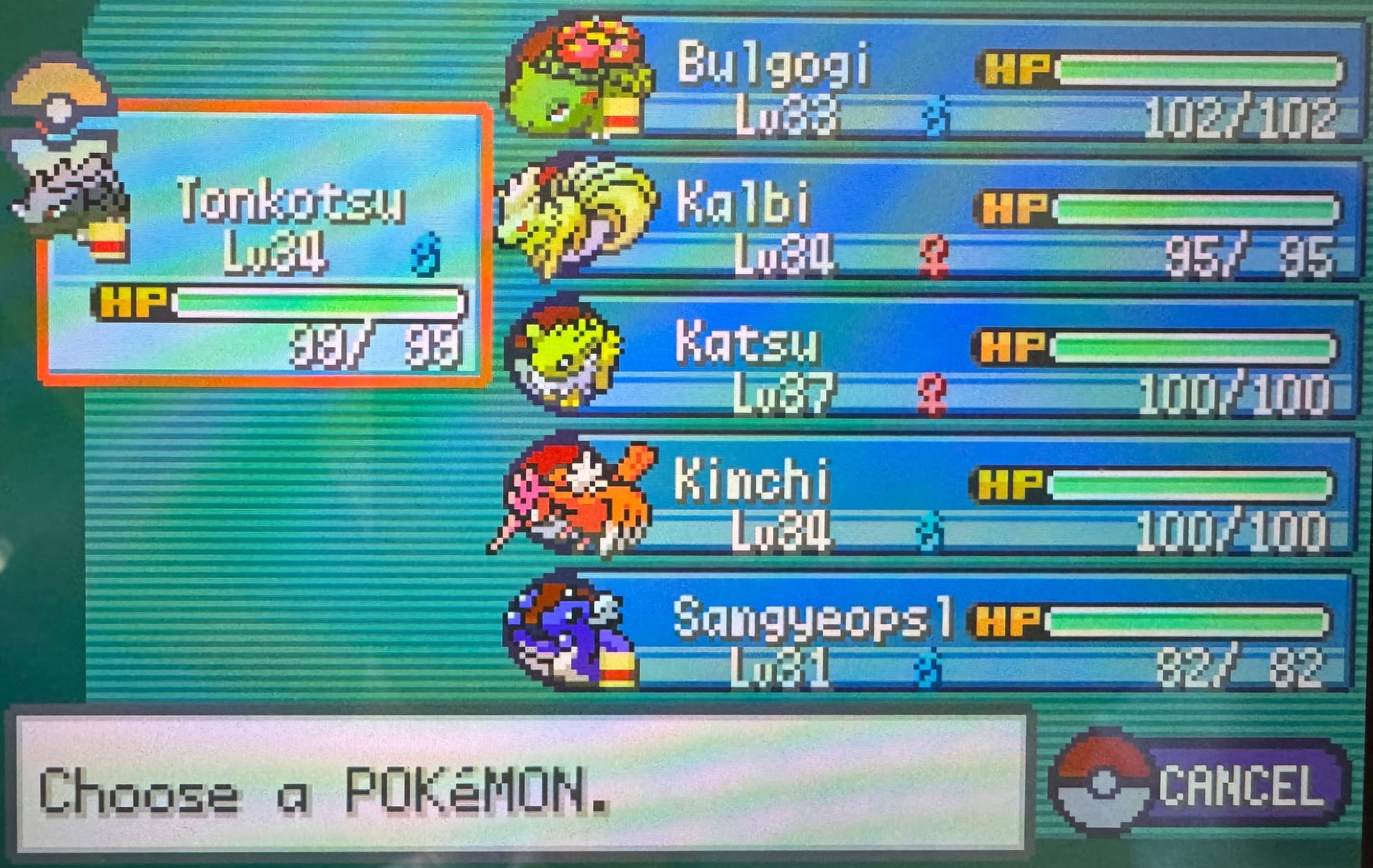 The Leaf Green playthrough is currently on 4/8 badges, and I think I've hit a good stride with this team. The naming team was Korean BBQ, because I was absolutely craving KBBQ when I started the game. Fearow MIGHT be switched out at some point as I don't necessarily need someone to have Fly in my party at all times, but it's a really solid physical attacker on a team of, essentially, all special attack users.