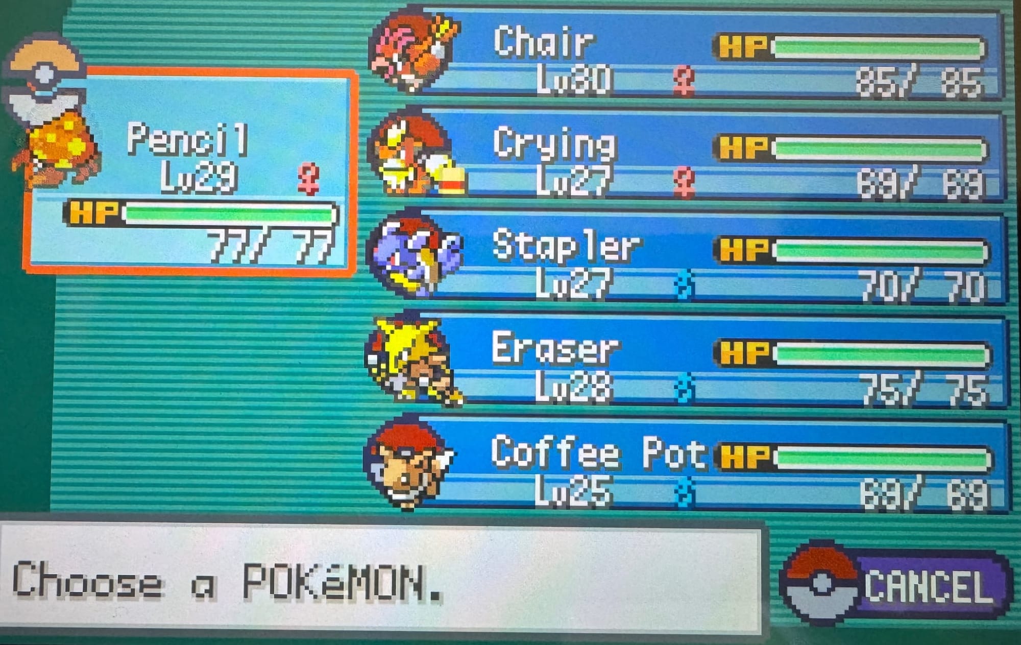 The Soullocke playthrough with Lizzie is... absolutely bonkers. The theme for nicknames was "things you would find in a corporate office", if you couldn't tell... Obviously Alakazam is great, and it's fun to actually be able to use one for the first time ever, but then you've got Pidgeotto which is just objectively mid-tier, and Parasect which has great physical attack stats but no real physical moves to use to its benefit other than like... Slash. In terms of team members that fell along the way, we had three that were... not great overall so they won't really be missed.